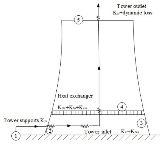 The structure chart of the NDDCT and the distribution diagram of air side resistance are displayed in Figure 5 and Figure 6, respectively. Clearly, the NDDCT consisted of the tower support columns, the heat exchanger bundles, the hyperbolic-type tower shell, and the sensors.
