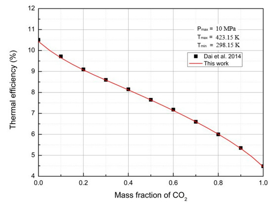 Firstly, the calculated thermal efficiency of CO2/R161 TRC was compared with that of Dai et al. [18]. As shown in Figure 7, the simulation results were consistent with those previously reported, which verified the correctness of our calculation. Moreover, those results also suggested that the thermal efficiency of CO2/R161 TRC was enhanced with the decrease in the CO2 mass fraction in CO2/R161 mixtures.