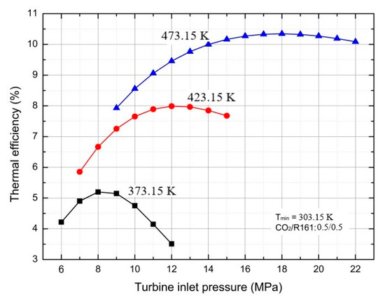 On the other hand, Figure 8 plots the changes in thermal efficiency depending on the variation of turbine inlet pressure at various turbine inlet temperatures using CO2/R161 (mass fraction of 0.5/0.5). As can be observed, the thermal efficiency was first increased and then decreased as the turbine inlet pressure was elevated. In other words, there was an optimal turbine inlet pressure to obtain the maximal thermal efficiency of the system. In addition, the optimal turbine inlet pressure was boosted with the increase in turbine inlet temperature. In our study, the optimal turbine inlet pressure was determined to be about 8.00 MPa at the turbine inlet temperature of 373.15 K, which was changed to about 18.00 MPa at the turbine inlet temperature of 473.15 K.