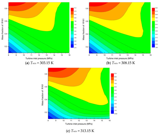 The evolution of the thermal efficiency with the variations in mass fraction and turbine inlet pressure at different minimum circulation temperatures is exhibited in Figure 9. Obviously, the thermal efficiency increased with the increase in turbine inlet pressure in the presence of low R161 mass fraction. In the meantime, the maximum thermal efficiency appear as the R161 mass fraction was increased. However, the thermal efficiency was gradually decreased with the increase in turbine inlet pressure at the high R161 mass fraction. Besides, the minimum circulation temperature would also affect the thermal efficiency of the system.
