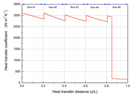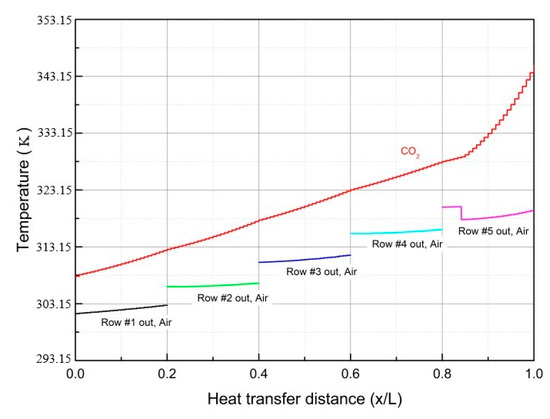 The temperature profiles of CO2 mixture and air in the cooling tower are presented in Figure 10. As can be figured out, the CO2 mixture had experienced transition from the single-phase vapor state to the vapor–liquid two-phase state in the fifth row of the finned tubes. Afterward, the CO2 mixture was slowly condensed into the saturated liquid during cooling from the fourth to the first row of the finned tubes. It is noted that the air temperature was plotted between every layer of finned tubes in the air-cooled heat exchangers. The discontinuity in the air temperature trends during phase change of the CO2/R161 mixture is due to an abrupt decrease in mixture heat transfer coefficient, which results in a high temperature difference in the vapor phase. However, the smaller rejection heat in the vapor phase reduced the air temperature difference. Moreover, the air temperature through the overall length of the cooling tower is shown in Appendix Figure A1. The heat transfer coefficient of CO2 mixture variation in the heat exchanger is presented in Figure 11. Clearly, the heat transfer coefficient of the CO2 mixture was about 200 W/m2·K at the single-phase vapor state, while that was increased to 3000 W/m2·K at the vapor–liquid two-phase state. The temperature difference in each row was about 3.00 K, and the outlet temperature of air at the fifth row of the finned tubes was about 318.15–320.15 K.