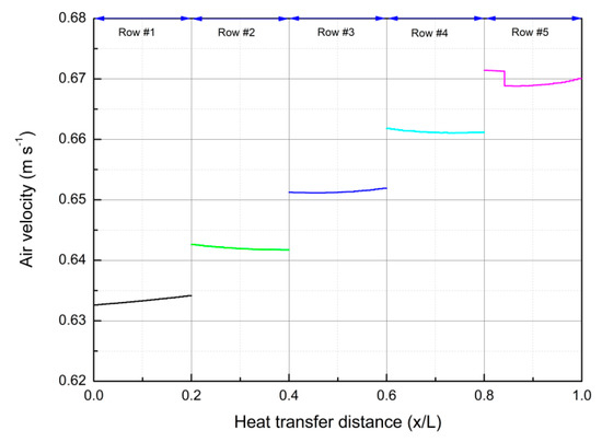 The air velocity through the heat exchanger bundles is calculated and presented in Figure 12. It is noted that the discontinuity in the air velocity trend is due to data selection, which are ones between every layer of finned tubes. Actually, air flows across tubes with a continuous velocity. The air velocity through the overall length of the cooling tower is shown in Appendix Figure A2. As can be seen, the air velocity was about 0.63 m/s at the first row of finned tubes, which was increased to 0.67 m/s at the fifth row of finned tubes. This was because air heating would result in a decrease in density and an increase in buoyancy, thus, giving rise to the increased air velocity through the heat exchanger bundles.