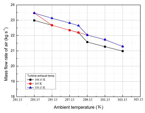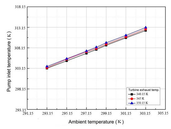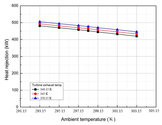 In addition, as presented in Figure 14, the heat rejection of cooling tower was increased as the turbine exhaust temperature was elevated (Figure 13) at the same ambient temperature, while the CO2 outlet temperature in the condenser remained largely unchanged. Typically, the driving force of air flow in the NDDCT was the density difference between the hot air in the cooling tower and the cool air out of the cooling tower. Additionally, the heat exchange was driven by the temperature difference between the air and the CO2 mixture. Thus, the density difference between air in and out of the cooling tower was enlarged as the turbine exhaust temperature was elevated, which would result in the increased mass flow rate of air and air velocity, finally boosting the heat rejection of the cooling tower.