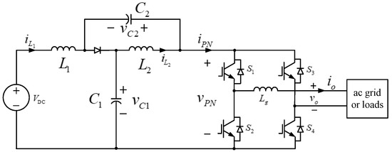 The single-phase quasi-Z-source inverter (QZSI) consists of two modules, a quasi-Z-source network, and an H-bridge, and the quasi-Z-source network includes two inductors, two capacitors, and a diode [1]. Different from traditional two-stage inverters, the QZSI reduces the number of active devices, has no dead time, and can realize DC-DC and DC-AC by its unique impedance network and shoot-through modulation method [2,3]. Currently, the QZSI has been widely studied and applied in photovoltaic power generation, AC speed regulation, electric vehicles, and as a module in cascaded multilevel inverters [4,5,6,7].