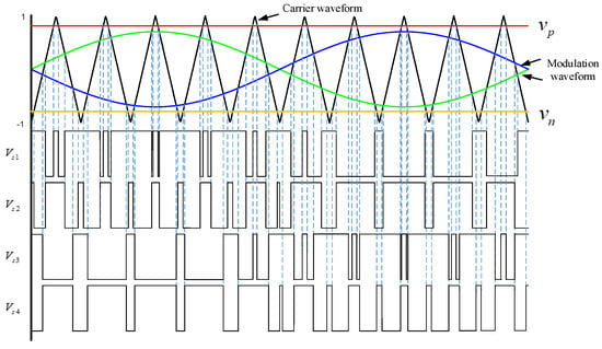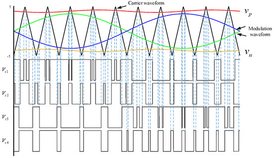 Figure 2 shows the conventional modulation strategy (CMS) for the single-phase QZSI using the unipolar modulation strategy; its modulation waveforms are two sinusoidal waves with a difference of 180°. The CMS uses two straight lines , to generate the shoot-through duty cycle. When the triangular carrier is greater than , the switch or turns on, and when the carrier is smaller than , the switch or turns on. and show the switch state of the switch – in the H-bridge, respectively.