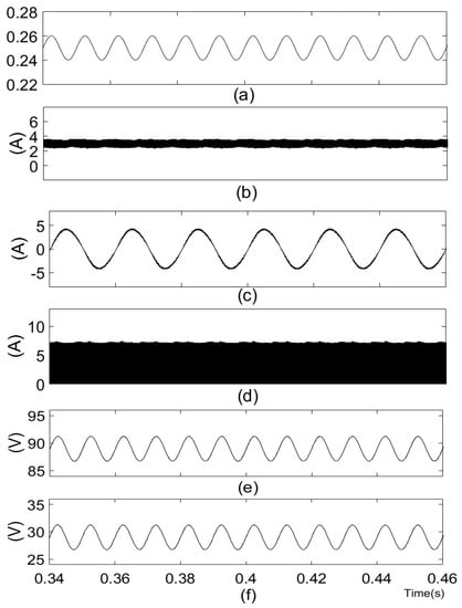 Figure 6 shows the simulation results of (a), (b), (c), (d), (e), and (f) with the RVCMS. With the proposed modulation strategy, the shoot-through duty cycle is a sine wave with a 2ω component; the current of inductor and the DC link have a little 2ω ripple. Figure 6e,f show the 2ω voltage ripple of capacitors reduced slightly compared to Figure 5e,f. The average values of , , , and are 2.993 A, 2.995 A, 88.98 V, and 28.98 V, and the amplitude of is 4.145 A, respectively. The simulation results show that the proposed RVCMS can effectively suppress the 2ω current ripple of inductors and can suppress the capacitor voltage ripple slightly compared to the CMS.
