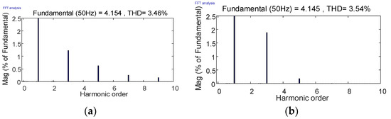 Table 2 lists the 2ω ripple ratios with the CMS and RVCMS. It can be seen that the 2ω inductor current ripple ratios decreased from 40.15% to 1.69%; the 2ω voltage ripple ratios of decreased from 3.14% to 2.53%, and decreased from 9.40% to 7.75%. If low 2ω ripple ratios in the DC side with the CMS are required, the large inductance and capacitance are necessary. From (20) and (21), assuming that and , the inductance and capacitance of quasi-Z-source network will be and , respectively, and the inductance is much larger than the value with the RVCMS, achieving the same ripple suppression effect. Figure 7 shows the FFT spectrum of the AC output current with the CMS and the RVCMS, and the total harmonic distortion (THD) are 3.46% and 3.54%, respectively. It can be seen that the proposed RVCMS has little effect on the output power quality.
