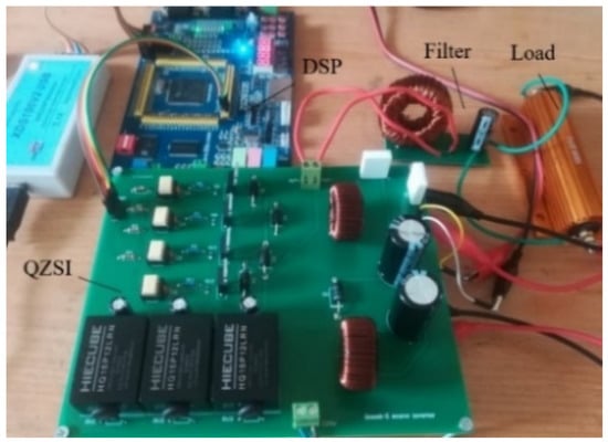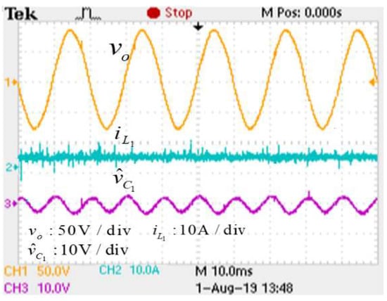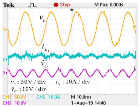A single-phase QZSI experimental prototype was built in the laboratory, as shown in Figure 8. The PWM control signals of the proposed RVCMS and CMS for switches were generated by a TMS320F28335 DSP. Figure 9 and Figure 10 show the experimental results with the CMS and RVCMS, respectively. The experimental results show that the 2ω current ripple of inductors reduced greatly and the 2ω ripple of capacitors reduced slightly with the RVCMS compared to the CMS. Simulation and experimental results verify that the proposed RVCMS can realize the suppression of 2ω ripples in addition to the functions of the DC-AC and voltage boost for the single-phase QZSI.