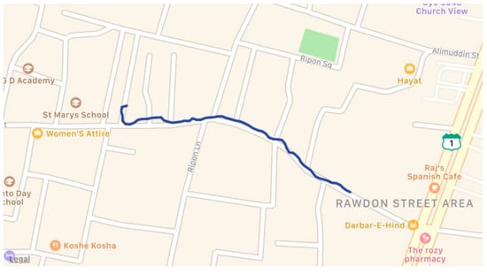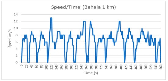 Figure 6 shows the speed/time graph for area 2—Behala, in which the same testing is shown. The results of the testing showed the top speed was 13 km/h. The energy used was 0.06 kWh; therefore, for the 42 km range, a total of 2.52 kWh, with an average wattage of 385.7 W.
