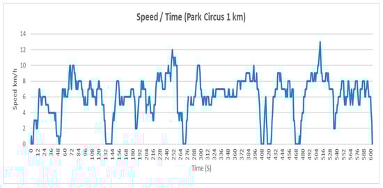 Figure 5 shows the speed/time graph for area 1—Park Circus, from which it can be seen the top speed was 13 km/h. The simulator calculated that the energy used based on the conditions set in Table 1 and Table 2, as 0.052 kWh. Knowing the kWh used in the 1 km journey, an estimation of the full 42 km expected range can be calculated as 2.142 kWh. The average wattage can be calculated as 304.5 W.