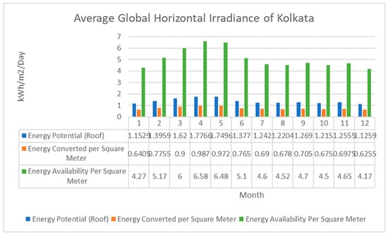 The average global horizontal irradiance of Kolkata is as shown in Figure 7, giving the researcher an indication of the highest and lowest expected solar availability by month. This allows calculation to be carried out to predict if the on-board solar panel will fully charge the vehicle each day [].