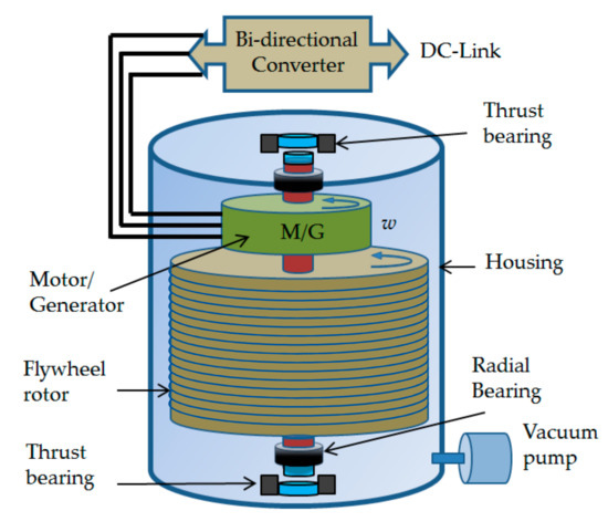 Flywheel state of charge (SOC) is maintained by operating the rotor at the desired speed by overcoming the standby losses arising due to bearing friction and aerodynamic drag, where the latter can be virtually eliminated by use of a sealed casing to hold the vacuum level. The power flow in a flywheel system can be managed by the size of the MG and is independent of the rotor, which provides the possibility of producing higher power capacities with a fairly small FESS suitable for a few tens of seconds or minutes.
