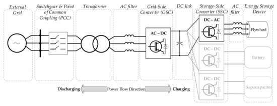 The power conversion system involving different forms of storage systems can be presented as shown in Figure 3. It shows the connection of the flywheel storage to an electrical grid through a DC-link. However, the same configuration can be used when connecting other storage systems (batteries, supercapacitors, or SMES) to the grid. All storage types link to the same DC bus and they are connected to the grid at the point-of-common-coupling (PCC). The components that the storage systems commonly share are the switchgear, transformer, AC filter, and the grid side converter (GSC), which communicates with the storage side converter (SSC) to maintain the voltage at the DC link.