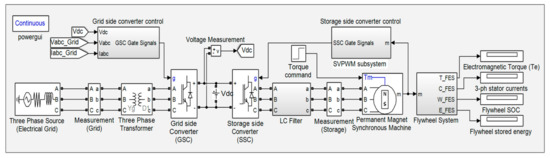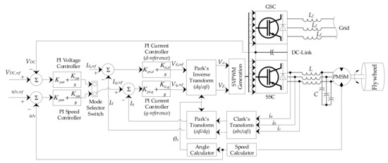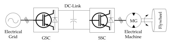 A generalized topology of the flywheel storage with a bi-directional power converter connected to an electrical grid is shown in Figure 4. The electrical supply and the FESS are connected through the DC-link and back-to-back converters. The power flow on the grid side is controlled by the GSC while the SSC controls the operation and flow of power in and out of the MG connected to the flywheel rotor. Therefore, the operation and energy conversion of the FESS is controlled by the MG.