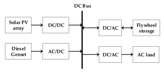 The model of a combined islanded PV system, diesel generator, and FESS supplying a dynamic variable load has been implemented in MATLAB/Simulink and the results are presented and analyzed in detail. All system components are connected to a common DC bus for better utilization of the energy and ease of control (Figure 7). The connected load has been chosen to be a typical residential load with variable demand throughout the day so that the operation and communication between the available sources of energy (PV, DGen, and FESS) are tested for close to real-life conditions. The load demand profiles were generated using CREST Demand Model that is a high-resolution energy demand model for building occupancies at the residential level [34].