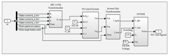 The control block diagram of the PMSM-Flywheel for the charging (motoring) and discharging (generating) states is presented in Figure 6. The operation of the SSC is controlled by cascaded control loops with an inner current loop and an outer speed loop to regulate the speed of the PMSM-Flywheel. The controlling operation of the cascaded loops is performed using PI controllers. In the inner control loop, the Clark-Park transformation is used to transform the measured three-phase stator currents to two-axis d–q currents. The flux and torque of the MG are controlled separately by the decoupled d–q currents using PI current controllers. The d-component of the current is the flux producing component and the q-component is the torque producing component [33]. Similarly, in the outer loop, the PMSM-Flywheel speed is measured and regulated by comparing it with the reference speed. The torque of the machine is controlled by applying the output of the speed regulator as the reference q-current component for the current regulator.