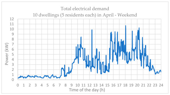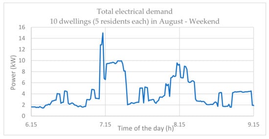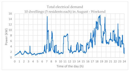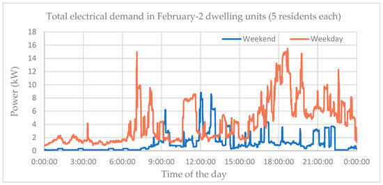 An excellent residential load demand has been developed from the CREST demand model that is a high-resolution stochastic model of integrated electrical-thermal demand at a domestic level [34]. The model calculates electrical demand based on appliances, lighting demand, and active resident occupancy. To account for load variations and random load spikes, the model uses a bottom-up approach to create “spikiness” from the simulation of switching the appliances on and off. Similarly, the natural behavior of occupants in using the appliances at home is determined. Although this is based on the UK time-use survey data [35], it is considered applicable to other countries with the exception of the air conditioning load, which could be added if needed following the same methodology as described in this paper. The data is used to generate stochastic profiles of the houses in order to consider different states such as the residents being active at home, asleep at home, or away from home and active, which is naturally related to use of appliances and, hence, the electrical demand [34]. The key parameters required for generating the load profiles are the day of the month, the month of the year, type of the day, the number of dwellings, and the total number of residents in a single dwelling unit. Figure 10 shows typical load profiles in February generated for two dwellings each with five residents. Typically, there are two peak times during the course of 24 h where the time of the peak is generally dependent on the type of the day—whether a weekend or a weekday. However, the peak times on a weekend is shifted and the occupants typically wake up late and sleep late (Figure 10). Additionally, the load distribution is quite irregular throughout the day and the occupants are active but perform different tasks at different times. The energy consumption on a weekend is also higher in comparison to a weekday given that the occupants are mainly at home.