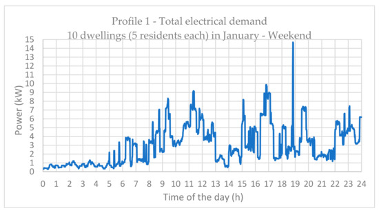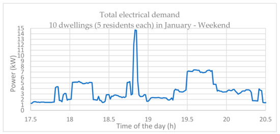 Profile 1 represents the total electrical demand for 10 dwellings on a January weekend (Figure 11). The morning peak demand starts to increase after 8 am and will diminish at 1 pm. The afternoon peak demand starts at 3 pm and lasts until 8:30 pm including a random spike at around 7 pm. The load demand for a duration of 3 h between 17:30–20:30 pm is selected for analysis (Figure 12). This includes a 15 kW peak demand during which the performance of the hybrid system will be very important.