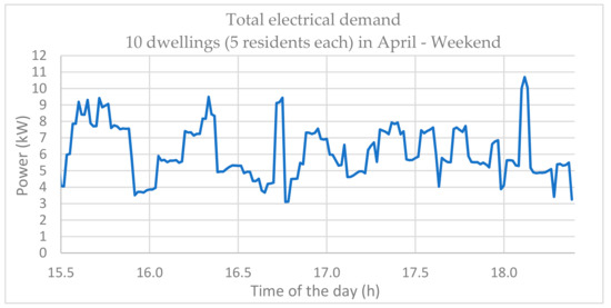Profile 2 represents the total electrical demand for 10 dwellings on an April weekend (Figure 13). This profile is relatively different to profile 1 because the peak times last longer and are quite scattered throughout the day. The morning peak lasts between 9 am and 3 pm while the afternoon peak starts at around 3 pm and lasts until 10 pm. The average load demand is also higher in the afternoon peak and, therefore, the 3-h peak time between 3:30–6:30 p.m. is selected for analysis (Figure 14). During this time, the load profile comprises the most fluctuations and the highest peak demand also falls within this period. Hence, the energy source, whether it is going to be a PV system, a DGen, an FESS, or a combination of these, will be hardly resting.