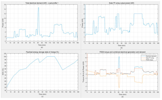 The load profile 1 and power output of the solar PV system along with the state of charge of the flywheel system is shown in Figure 19. Throughout the course of 3 h, the demand is mostly lower than the maximum rating of the PV system except for the two peaks arising at t = 80 min and t = 120 min. With the flywheel initially at its minimum 50% SOC, there is surplus energy available to charge it up to more than 95% before it discharges at t = 80 min to cover the peak demand (Figure 19c). After brushing the short load spike, it starts to charge again until it reaches 100% SOC and switches to a standby mode for approximately 18 min (t = 102–120 min).
