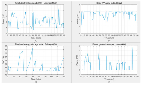 (a) Load profile 2. (b) PV array output power. (c) Flywheel initially at 50% state of charge. (d) Diesel generator output power.