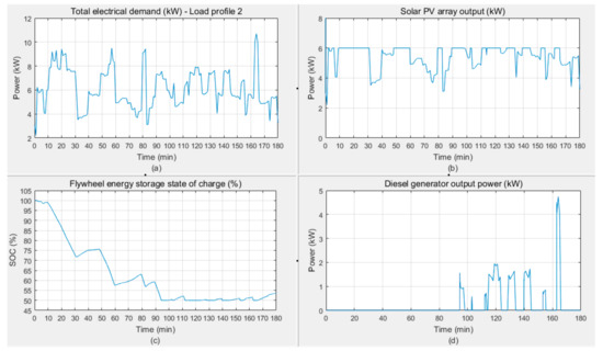 (a) Load profile 2. (b) PV array output power. (c) Flywheel initially at 100% state of charge. (d) Diesel generator output power.