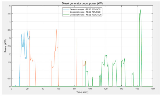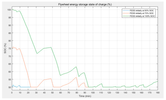 The above situation can be improved if the flywheel is initially fully charged (100% SOC) and can deliver energy immediately when demanded. Since the major peak demands appear at the beginning of load profile 2, a fully charged flywheel can keep the generator off for a longer period, as shown in Figure 21. The flywheel discharges at t = 10 min and covers the excess demand for about 85 min before it reaches 50% SOC and switches to a standby mode. The power output plot of the diesel generator shows how the flywheel has reduced the operation time of the generator (Figure 21d).