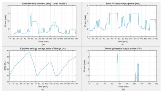 Compared to load profile 1, the conditions for load profile 2 is very challenging since the demand varies for the whole 3-h period with many lengthy peaks. This implies that the backup energy sources (DGen or FESS) will be in service continuously (Figure 20). The first peak demand appears at t = 10 min when the load is above 6 kW and the flywheel is needed to cover the surplus in demand. However, since the flywheel is at its minimum charge level (50% SOC), it switches to standby mode and the generator is called to supply the load (Figure 20c,d). Shortly after (at about t = 30 min) when the load demand decreases, the flywheel starts charging using the surplus power available from the PV system. This charging and discharging process of the flywheel continues until the end but the charge state is not improved due to the nature of the demand. It partially helps the diesel generator with the peak demands, but, despite this, the generator is still active and running frequently—catching up with the supply shortage from the PV system (Figure 20d). It can be seen that the generator is turned on when the FESS is in a standby mode. Otherwise, the flywheel will be either charging or discharging.