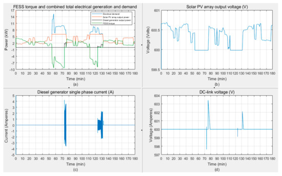 The initial charging condition of the flywheel is vital in reducing the load on the generator. Therefore, the system is examined for 50%, 75%, and 100% SOC scenarios and the results are shown in Figure 22 and Figure 23. The voltage and currents of the diesel generator and PV system for the case of a fully charged flywheel is presented in Figure 24 showing the compliance of the model. There is a large current spike (t = 164 min) due to a sudden increase in the load and commanding an instant diesel generator engagement. The DC-link voltage drop is also slightly more than 5 V at this instant. However, it is still not too far from the acceptable ±5% voltage drop level.