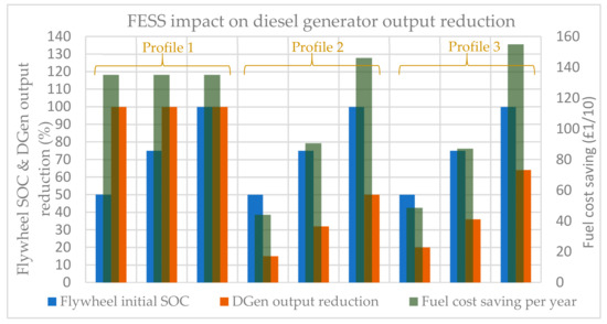 On some occasions, the flywheel storage fully rested the diesel generator (i.e., load profile 1) when the PV, DGen, and FESS were operating as a hybrid system. For load profile 2 that both the flywheel and diesel generator were quite engaged due to the nature of the demand, the FESS can contribute up to 50% of the DGen load and bring approximately £1460 savings per year. In the worst-case scenario when the initial stored energy of the flywheel was at a minimum (50% SOC), it has contributed toward reducing the operation of the diesel engine by 15% with nearly £440 savings per year. Furthermore, in the case of load profile 3, the flywheel impact in terms of percentage reduction in diesel generator supply has been approximately 65% with a total annual fuel savings of £1550 per annum.