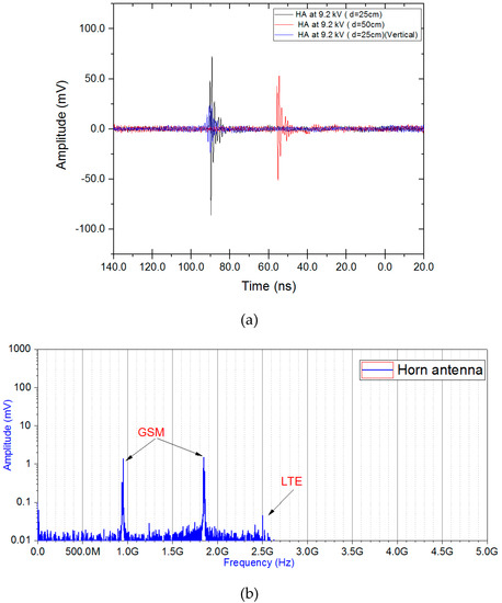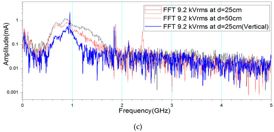 The frequency spectrum of the noise level (Figure 2b) and that of the measured signals shown in Figure 2c confirm the frequency range of the EM signals emitted by the surface discharge. Peaks detected at 0.9 GHz, 1.85 GHz and 2.5 GHz are superimposed GSM and long-term evolution (LTE) signals. The results show that the UHF detection can be improved by placing the sensor closer to the discharge source in a horizontal direction. Signals produced by a cavity discharge were measured by using a specially made XLPE block samples with a needle-plane electrode system and were also found to be within the UHF band.