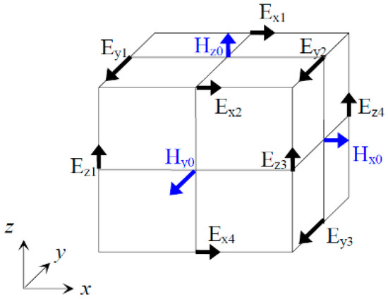 The FDTD method is a powerful electromagnetic simulation tool that has been extensively used for studying radio wave propagation in multiple media. Maxwell’s equations in the time domain are solved using finite-difference time approximations. Since the electric and magnetic fields are related in time and space, both space segmentation and time stepping are required. Space segmentation takes the form of box-shaped cells whose size are constrained by the wavelength of the EM excitation signals, and its maximum must be less than 1/10 of the smallest wavelength for greater accuracy, giving , where c is the velocity of light and f the frequency. For propagation in insulation materials, c is reduced and sol the cell size will be reduced. The electric field (E) and magnetic field (H) components are staggered, with the E-field components centered on the edges of the box and the H-field components centered on the faces to form what is known as the Yee cell [19], as shown in Figure 3. The modelled volume space, including any material constituting the model is built by interconnection of these cells, forming the FDTD mesh.