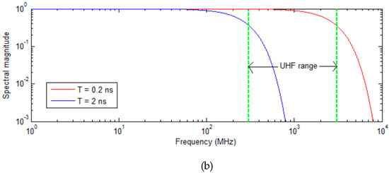 Computed signal amplitudes for the cavity discharge, partial discharge (PD) pulse amplitude = 1 A, UHF sensor positions (a) d = 200 mm (b) 500 mm.