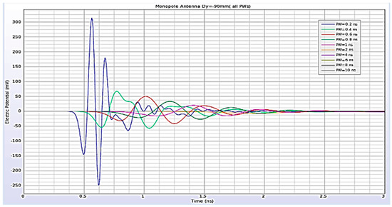 The cavity discharge was simulated by introducing a current filament flowing in the vertical direction in the middle of the XLPE sample. The PD path was varied between the minimum value of 1.5 mm, constrained by the FDTD cell size within the material, and the maximum value of 2.5 mm was constrained by the sample thickness. The non-uniform field, point-plate electrode configuration was used for this analysis. Figure 11 shows examples of typical time-domain signals generated by a 1-A pulse, with a width of 1 ns and a path length of 2 mm, demonstrating the need to place the UHF sensor closer to the discharge for increased sensitivity.