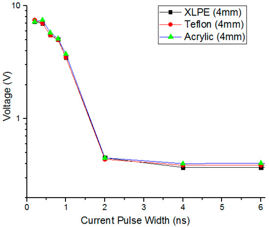 The length of the current filament determines the discharge path over which the charge is deposited. The results presented in the third row of Figure 9 and Figure 10 show a proportional increase in UHF signal magnitude with the PD path for a given pulse width and intensity. With the shortest UF sensor distance, XLPE showed slightly lower signal magnitudes compared with Teflon and Acrylic for the non-uniform field configuration (Figure 9). For the uniform field configuration, the Teflon samples showed the smallest magnitudes, with the difference between materials increasing for higher intensity discharges.