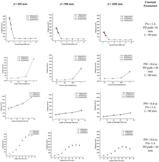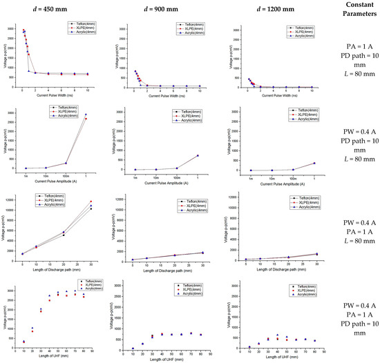 In this section, the PD pulse width (PW), its amplitude (PA), and its path length are parameterized at each computation sequence for a given sensor location and length. The sensor location and length are then varied in sequence to complete the parametric computation. An example of the time-domain voltage signal across the antenna sensor placed at a distance 900 mm from the origin of the discharge is shown in Figure 7 for different pulse widths for the XLPE material sample. For fast-rising pulses, the captured signals are large but attenuate very quickly, whereas for slower pulses the signals are much smaller. The time delays observed between the waveforms are due to the different times of arrival of EM waves at the sensor. The maximum peak-to-peak value of the waveform is taken in what follows as the amplitude of the captured sensor signal, and represents the PD intensity. It was found that the amplitudes of the signals computed with the three different sample materials having the same dimensions did not reveal any appreciable differences, as shown in the example of Figure 8, except in a few cases which will be discussed later. This was the case over the entire range of parameter values considered in this study. For a given sequence, one parameter was varied and all other parameters were kept constant at their reference values. The results are grouped in Figure 9 and Figure 10 for the non-uniform and uniform electrode configuration, respectively, and for three different sensor locations, represented by distance (d). The first conclusion from these results is that signals in the non-uniform point-plane configuration (Figure 9) have higher amplitudes than those measured in the uniform plane-plane configuration (Figure 10). Furthermore, it was found that locating the sensor along the vertical axis (i.e., at a distance above or below the PD source) produces smaller signal amplitudes compared with the horizontal y-axis location—only the results related to the latter are shown here.