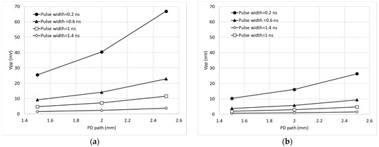 The main parameters that were varied in this case are the pulse width, the PD pulse path and the UHF sensor location. The PD pulse amplitude was kept constant at 1 A. The results for two different UHF sensor positions are shown in Figure 12. First, it should be noted that the amplitudes of the radiated signals from the cavity discharge are much smaller than those obtained with surface discharge. This is because the EM waves propagate through the XLPE insulation and the surrounding air medium, which causes further attenuation. In practice, additional attenuation due to metallic enclosures in cable joints and cable metallic sheaths makes the detection of PD from internal cavities even more challenging because they shield the EM waves from the outside medium. The results show signal amplitudes increasing with PD path, with the highest increase being associated with fast PD pulses. A combination of measurements and FDTD simulations would enable a better understanding of the cavity discharge characteristics, such as deducing the PD pulse shape that would best fit the measurement results.