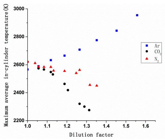 Figure 5 shows the variation in the in-cylinder temperature as a function of crank angle with different DF. It can be clearly seen from Figure 5, as the DF increases, the peak of in-cylinder temperature of CO2 and N2 decreased and the crank angle matched with peak value was delayed. But for Ar, in-cylinder temperature became higher with the DF increasing, and its peak value was always near the top dead center. Figure 6 compares the maximum average in-cylinder temperature of the three dilution gases, the maximum average in-cylinder temperature of Ar increased continuously but the trend was opposite to CO2 and N2, CO2 showed the fastest falling speed. According to Figure 2 and Equation (5), due to the higher heat capacity meaning more heat is needed for changing 1 K [35], CO2 has the highest heat capacity under high temperature and showed the most obviously cooling effect followed by N2 and Ar. At the same time, the decrease in temperature caused the in-cylinder combustion preparation phase to be extended and the combustion reaction rate to be slowed down, so the moment when the highest temperature occurs was postponed.
