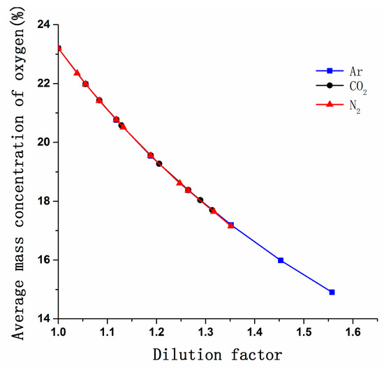 Variation in the O2 concentration in the cylinder vs. the DF of CO2, N2, and Ar.