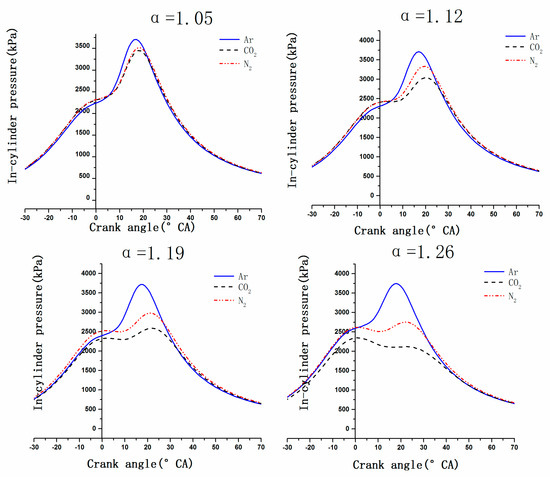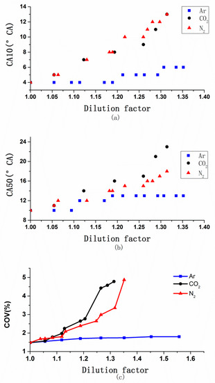 Combustion is affected by chemical reaction kinetics, and temperature is the most important parameter of chemical reactions [37]. According to combustion theory, charging any kinds of diluent gas will affect the combustion process, and the introduction of inert gas with high thermal diffusivity is conducive to the spread of flame [38,39,40]. As shown in Figure 4, Ar has higher thermal diffusivity than air so that it was more conducive to fire nucleation and flame propagation. Both the thermal effect and dilution effect of Ar can affect CA10, CA50 and COV, but the former was stronger, so that CA10, CA50 and COV have not been delayed obviously. By contrast, when using CO2 or N2 as dilution gas, combustion reaction speed turned slowly because of the in-cylinder temperature decreasing. Moreover, according to Zhaoyang Chen [38], Ar and N2 are all chemically passive agents and do not participate in in-cylinder chemical reaction. Although CO2 is also a chemical passive agent, it is a major reaction product. CO2 weakens the flame and decreases the H atom concentration because of the reversal of the reaction, CO + OH = CO2 + H. Hence CO2 has chemical effect on combustion which was different from the other two gases, and it led to the lowest flame values so that delay of CA10, CA50 and COV was the most serious, followed by N2 and Ar.