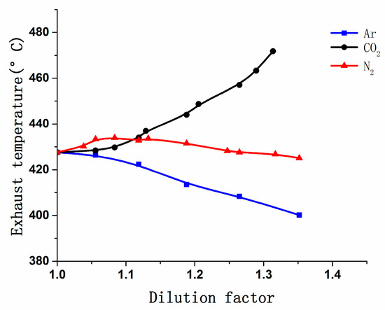 It can be seen clearly in Figure 10 that when CO2 was charged, exhaust temperature increased as the dilution factor was increasing; for N2, the exhaust temperature increased slightly first, then the curve became flat; but Ar showed the opposite trend. As shown in Figure 8 and Figure 9, combustion duration was extended and CA10 was postponed when N2 and CO2 are charged, post-combustion was longer, and the combustion stability became worse, so a part of the mixture burned in the exhaust pipes, which made exhaust temperature rise. However, CO2 was more potent in delaying combustion, so it made exhaust temperature continue rising.