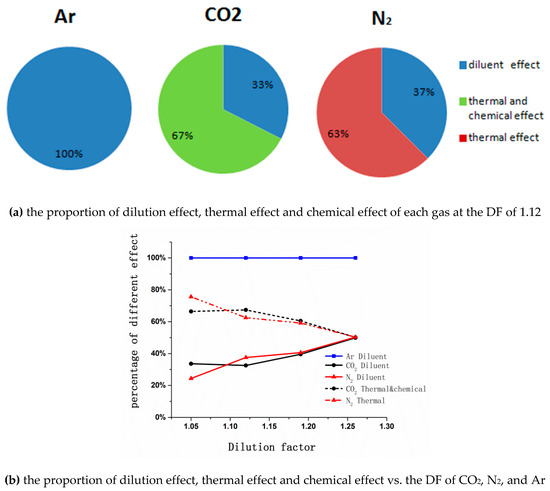 According to Figure 12a, the dilution effect of Ar reduced NOx emissions by 253 ppm by 100%. N2 reduced NOx emissions by 675 ppm, with dilution effects accounting for 37%, and thermal effect accounting for 63%. CO2 reduced NOx emissions by 778 ppm, with a dilution effect of 33%, and thermal effect and chemical effect of 67% totally. Figure 12b depicts the variations of the proportion of dilution effect, thermal effect and chemical effect of different dilution factors. As shown in (b), the decreased NOx emissions of Ar were all caused by the dilution effect, and with the DF increasing, the dilution effect on CO2 and N2 was gradually strengthened.