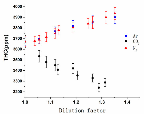 Variation in THC emissions vs. the DF of CO2, N2, and Ar.