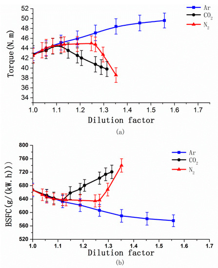 Figure 14 shows the effects of CO2, N2 and Ar on brake-specific fuel consumption (BSFC) and torque. BSFC was falling first and then rising with increasing DF no matter what kind of gas was charged. Torque experienced the opposite trend. The BSFC reached a minimum of 575.56 g/(kW.h), 86.2% of the original machine, and torque reached a maximum of 49.6 N.m as the DF at 1.56 for Ar. When the DF was 1.12 for CO2, the BSFC reached a minimum of 638.65 g/(kW.h), 95.75% of the original machine, and torque reached a maximum of 44.73 N.m. The BSFC reached a minimum of 634.39 g/(kW.h), 95.11% of the original machine, and torque reached a maximum of 45 N.m, with the DF was 1.25 for N2. There are two main factors affecting the BSFC, the specific heat ratio of the mixture and the in-cylinder combustion condition. According to the theoretical cycle of an internal combustion engine, the smaller the specific heat ratio of mixture, the lower theoretical heat efficiency, and the higher the BSFC [33].