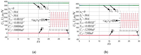 In order to verify the relationship between and Δc, an external capacitor Cadd = 10,000 uF was used. Figure 18 shows the waveforms of UII1 and UII2 when Cadd is connected. From this figure, it can be seen that the deviation is nearly stable when the capacitor is connected, which corresponds to Equation (39). It also can be found that Cadd affects the amplitude of the third component.