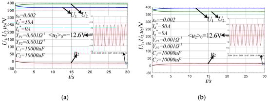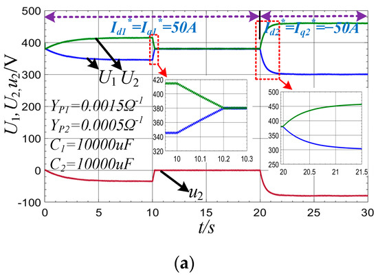 In order to validate the effectiveness of voltage balancing control, the current reference values were changed, and the waveforms of U1 and U2 are shown in Figure 19. From this figure, it can be seen that the balancing control considering Ivd works very well.