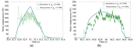 The output power from the hydraulic motor shaft drives the electrical generation system, higher output power indicates greater potential for electricity generation. The simulated hydraulic motor output power of 3 MPa, 6.6 MPa, or 15 MPa accumulator pre-charged pressures were validated by being compared to the experimental results, as shown in Figure 9a–c.