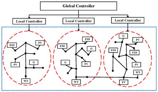 According to the working report of CIGRE C6.11 [19], the DER integrated ADN can be defined as the integrated control of different types of DER, such as PV, WT, ESS, and microgrids. Its flexible network technology can be used to achieve effective power flow management. However, the operation mode of this system is more complex than a traditional DN. The amount of communication data can easily cause information congestion. In order to increase the computing speed and improve the optimal operation ability, the ADN partition scheme is proposed in this paper, which can be optimized locally. There is no need to understand the internal topology among the partitions, and there is only a need to exchange some boundary information to achieve the purpose of coordination and optimization.