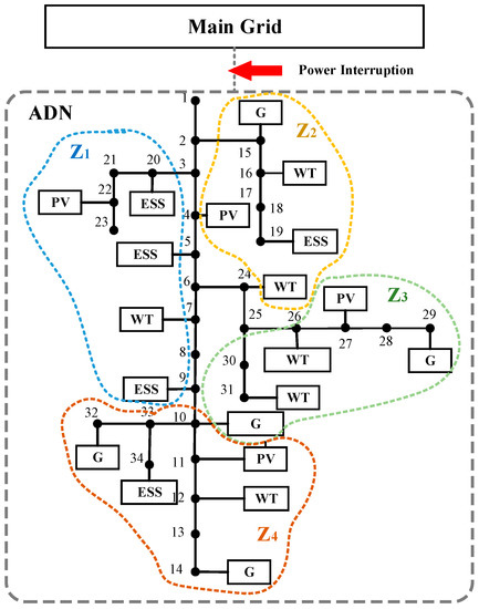 The adverse impacts of extreme weather events and natural disasters on electric grids has attracted worldwide attention, and the way to enhance the distribution network (DN) resilience needs to further studied. In fact, the ability to overcome and recover from incidents, such as power interruption, in an optimal operation mode, is necessary for any power system. The optimal operation mode aims to minimize the total energy supply cut and enable quicker restoration [1,2]. In order to increase the recovery ability under the power interruption of the main grid, multi types of distributed energy resources (DER) consisting of non-dispatchable sources, dispatchable distributed micro-sources, and energy storage units integrate into the DN. The examples of non-dispatchable sources, include but are not limited to, photovoltaic (PV) panels and wind turbines (WT). More specially, photovoltaic power generation is a static power generation, has zero emission, zero radiation, and zero pollution. Moreover, it has low operating and maintenance costs, does not include fuel-free costs, and is unaffected by rising energy prices. The examples of energy storage units include, but are not limited to, energy storage stations (ESS). DERs are able to supply those loads, located in the DN, when the unpredicted incident happens, by utilizing renewable energies or storage systems. According to the definition, the integration of DER will strength the recovery ability. Nevertheless, the gradual integration of DER brings new challenges and requirements to the traditional DN planning and operation strategy [3]. To adapt to this change, it must be transformed into an active distribution network (ADN) with active power flow control and load interaction ability [4]. ADN is a technical solution that can optimize and achieve use efficiency of DER. Moreover, it can achieve power rebalancing and maintain the energy supply for internal and peripheral loads.