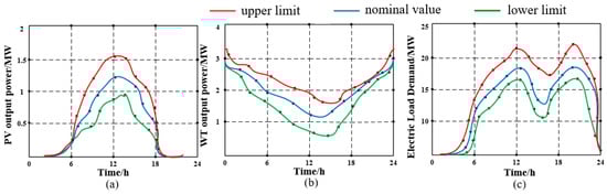 (a) The fluctuated curve of photovoltaic (PV) on Node-4; (b) The fluctuated curve of wind turbines (WT) on Node-7; (c) The fluctuated curve of total electric load demand.